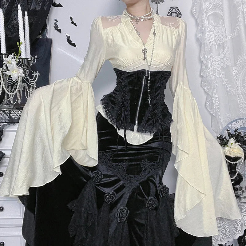 Gothic Romantic Goth Vintage V-neck Bell Sleeve Top (available in 2 colors)