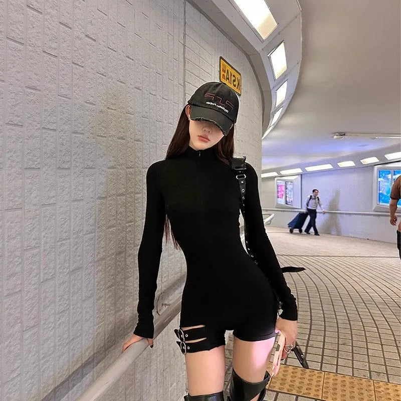 Gothic Alt Goth Long Sleeve Thigh Straps Bodysuit Rompers