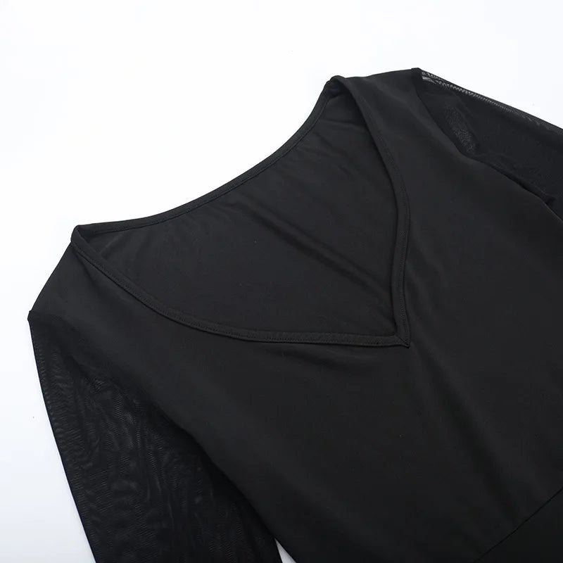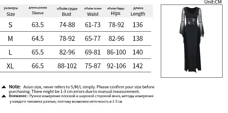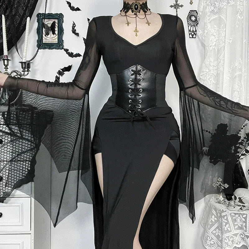 Gothic Dark Romantic Goth Sheer Flare Sleeves High Slit Wide Belt Long Dress