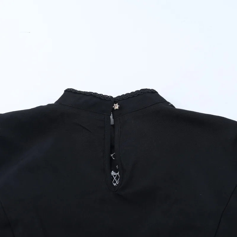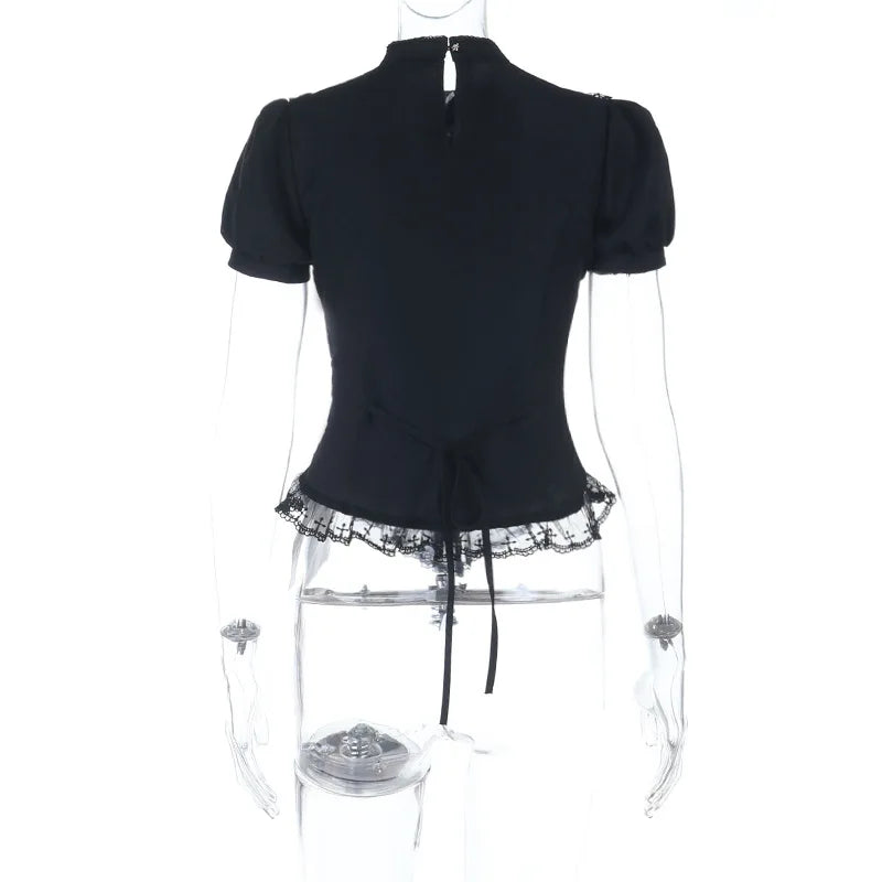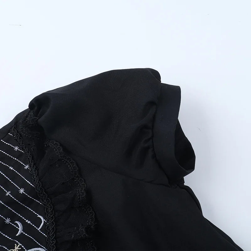 Gothic Moon Cathedral Embroidery Lace Trim Puff Sleeve Top