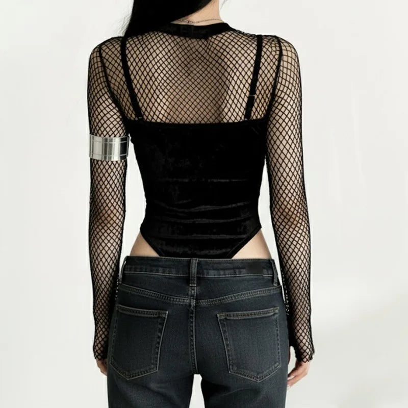 Gothic Y2K Alt Goth Cross Embroidered Fishnet Bodysuit Top