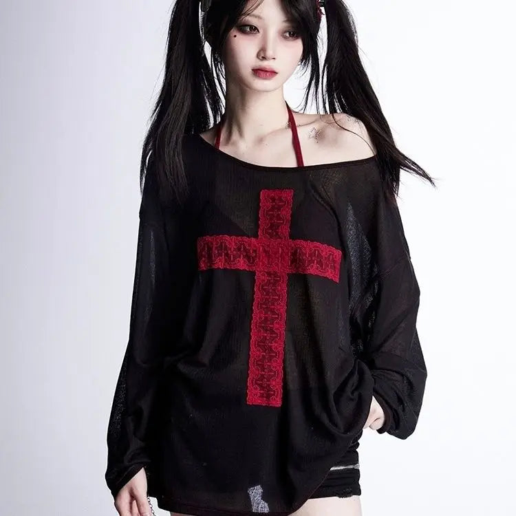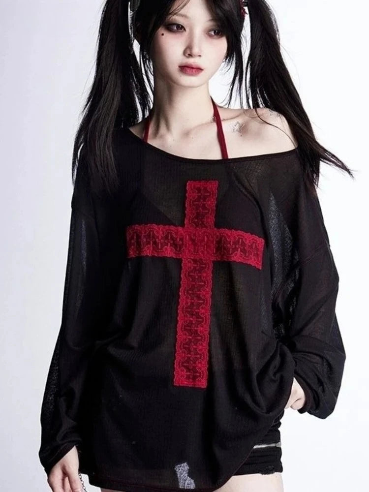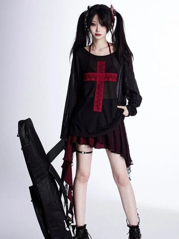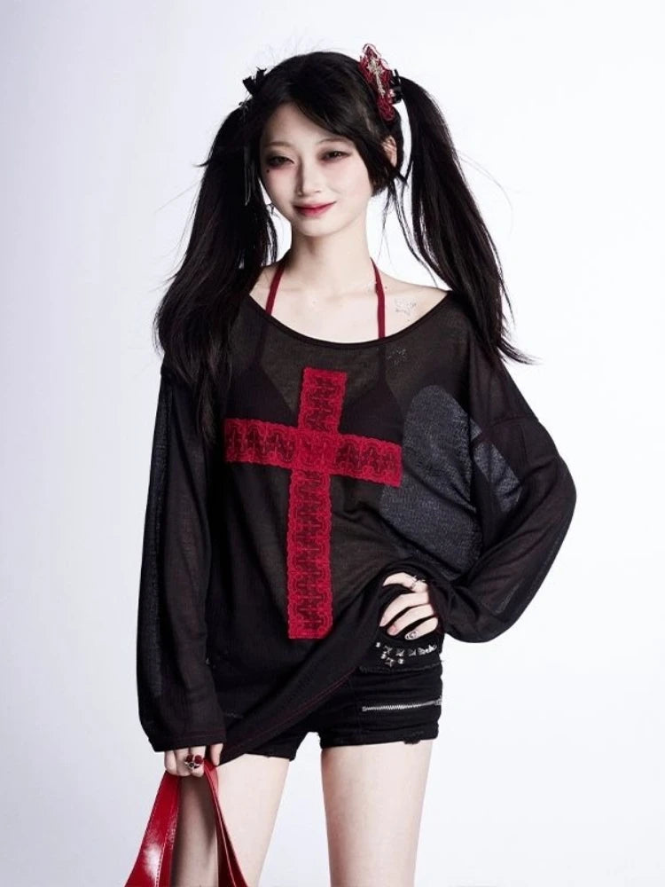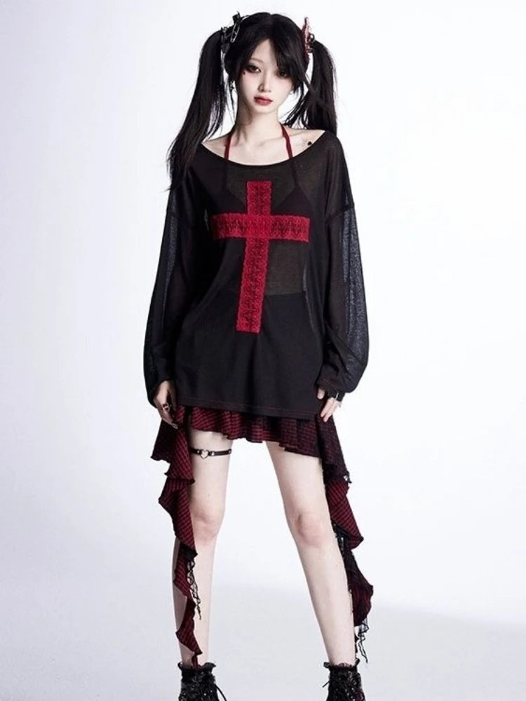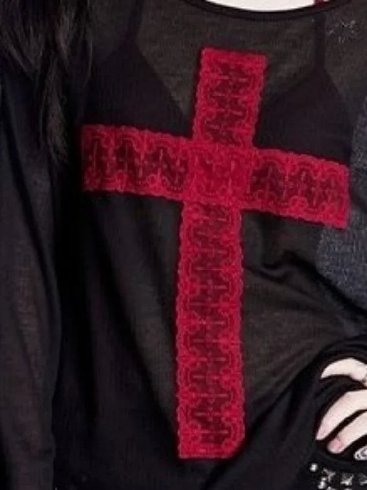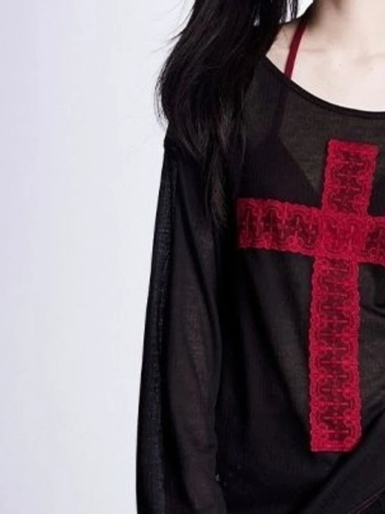 Gothic Y2K Alt Goth Cross Patchwork See Through Long Sleeve Top